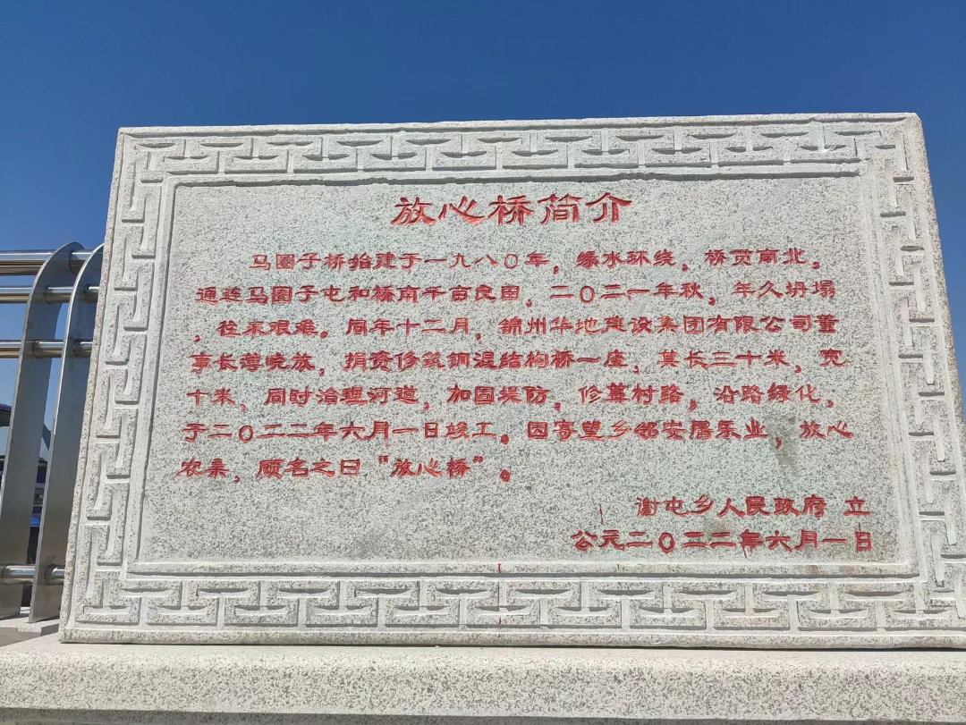 錦州華地建設(shè)集團(tuán)董事長(zhǎng)薄曉放,得知了這一消息后,非常惦念家鄉(xiāng)父老,立即決定捐建一座橋,以解決家鄉(xiāng)人們出行難的問(wèn)題。因寄望鄉(xiāng)鄰安居樂業(yè),放心農(nóng)桑,故取名放心橋。